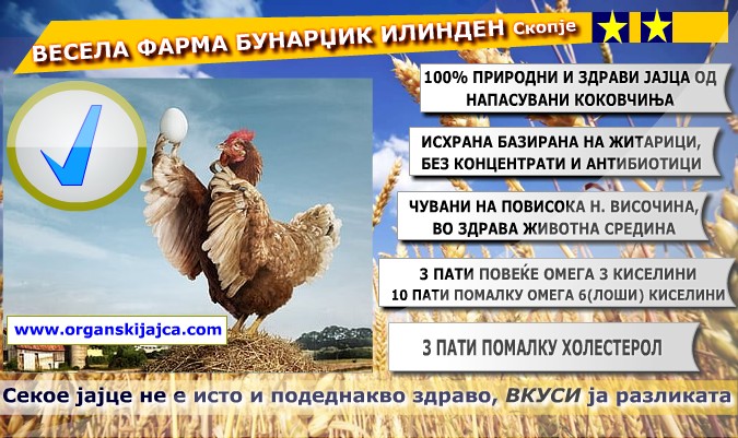 ![]() Има 1 слики Добредојдовте на нашиот веб сајт www.organskijajca.com на нашата Весела ФАРМА Бунарџик Илинден каде што природата и здравата храна се спојуваат! Претпоставуваме дека Вашата посета на нашиот веб сајт www.organskijajca.com се должи на желбата да се вкусат навистина здрави јајциња што се сосема различни од комерцијалните и тие што вообичаено се продаваат или пак можеби вашата посета е од едукативен карактер за работите да ви станат појасни. ![]() Како и да е, на нашиот сајт можете да се информирате за тоа какви се нашите јајца што нашите коковчиња секојдневно ги несат (со 3 пати повеќе омега-3 киселини, 10 пати помалку омега -6 киселини (лоши, инфламаторни), 3 пати помалку холестерол и многу, многу повеќе витамин А, Е, Д и бета каротен) ,како се хранат, како храната влијае на квалитетот на јајцата и здравјето на коковчињата, но како и природната средина влијае врз квалитетот на јајцата, на пример како сонцето влијае кон драстично поголема содржина на витамин Д кај нашите јајца во споредба со тие добиени од комерцијалните коковчиња и други што се чуваат во затворен простор без пристап до зелени површини... Сајтот има за цел да ја спои природата со здравата храна, концепт кој што постепено исчезнува во комерцијалниот свет каде што при трката за профитот често се заборава на квалитетот, а кој квалитет директно влијае на нашето здравје! ![]() Други линкови!